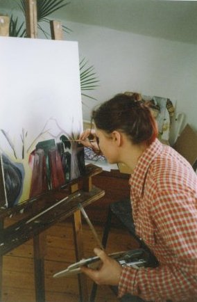 Mit Ölfarbe malt sie auf grundiertem Untergrund, wobei sie Farben wählt, die vom Wirklichkeitsbild abweichen.